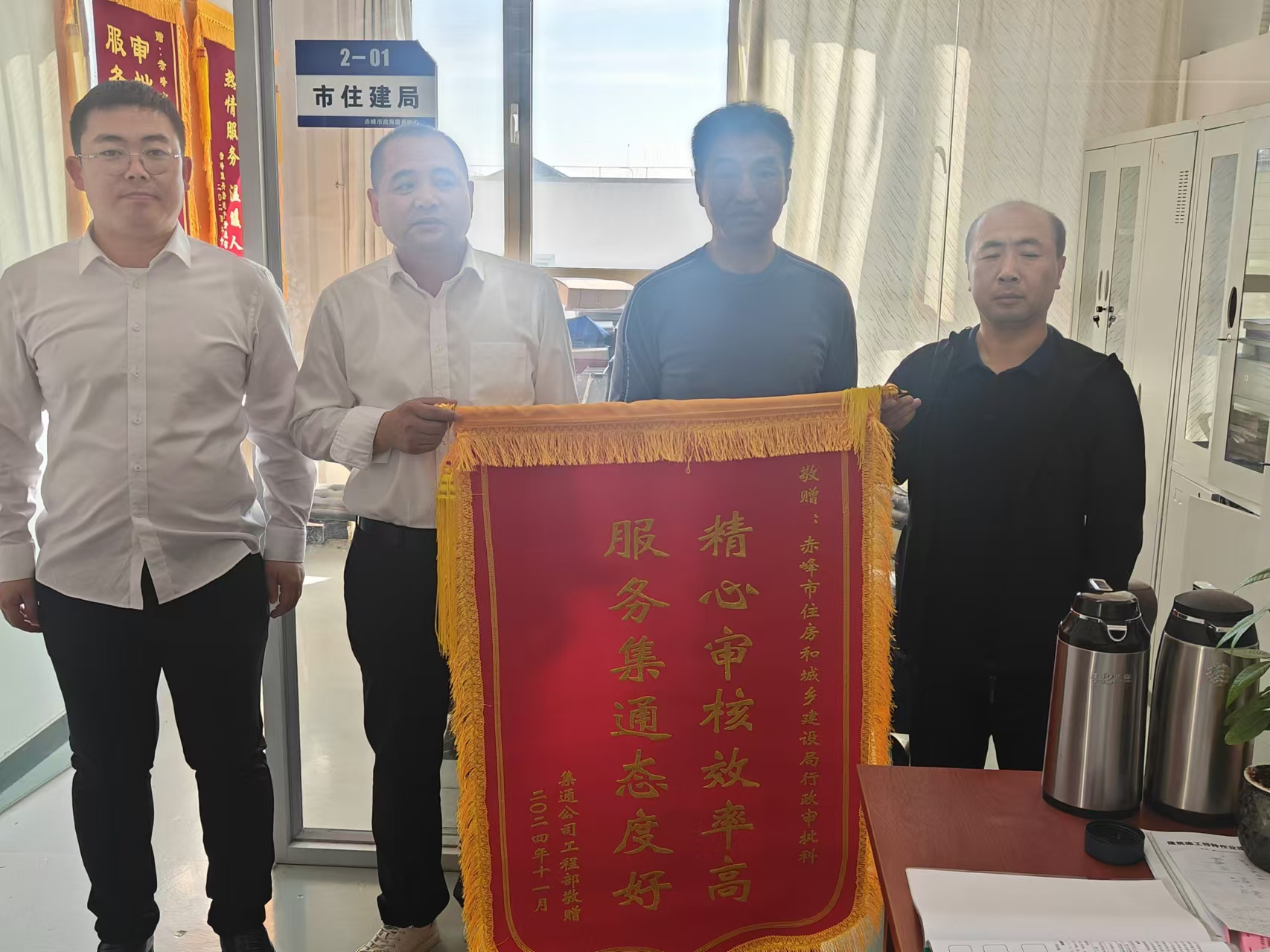 11月15日,住建局驻政务中心窗口收到来自集通铁路公司工程部的锦旗,锦旗内容为“精心审核效率高,服务集通态度好”,企业人员对我局窗口快捷高效办理相关手续,表示了感谢和认可。